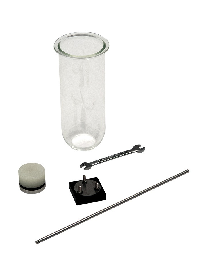 Small Volume Mini Intrinsic Dissolution Apparatus, Paddle Over Stationary Disk. Includes small volume flat bottom vessel, 2 mm hardened steel punch, 2 mm stainless steel die, gasket, cap, wrench, surface plate, and extraction / introduction tool.